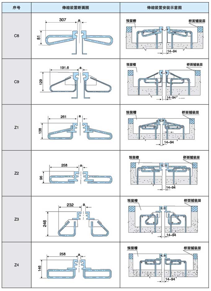 橋梁伸縮裝置各種規(guī)格總體尺寸與安裝示意圖