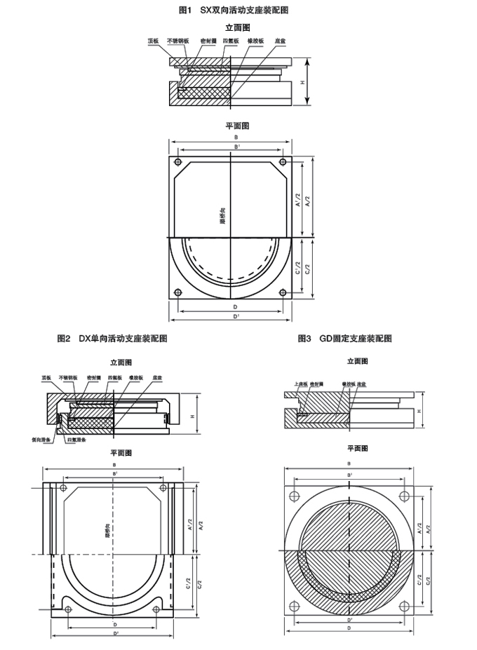 固定支座由上座板、密封圈、橡膠板、底盆、地角螵栓和防塵罩等組成。