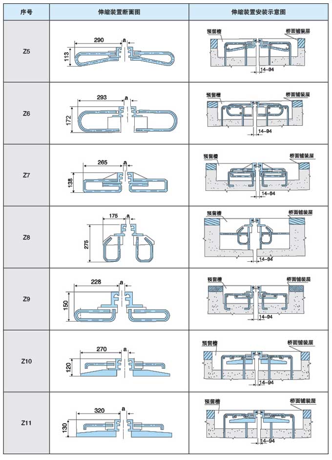 橋梁伸縮裝置各種規(guī)格總體尺寸與安裝示意圖