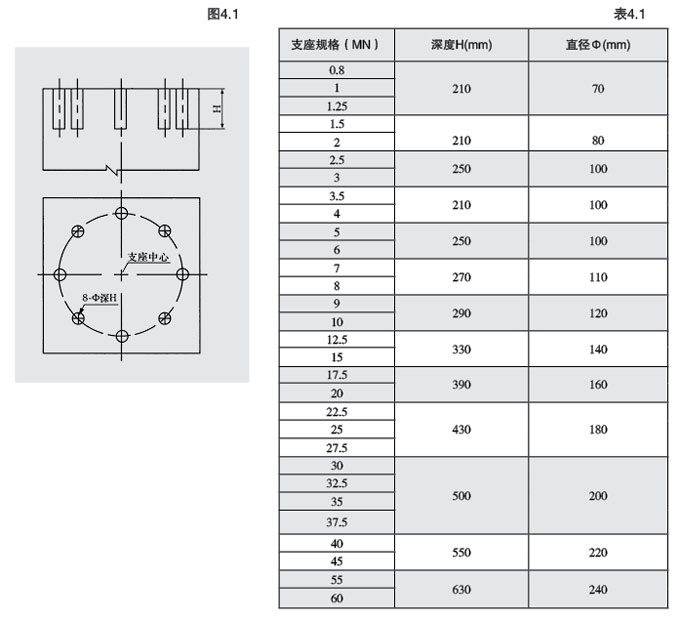 a.澆注壤臺墊石時,在墊石頂面做出地腳蜾栓套筒預(yù)留孔。如圖4.1所示,預(yù)留孔深度及直徑見表4.1。
